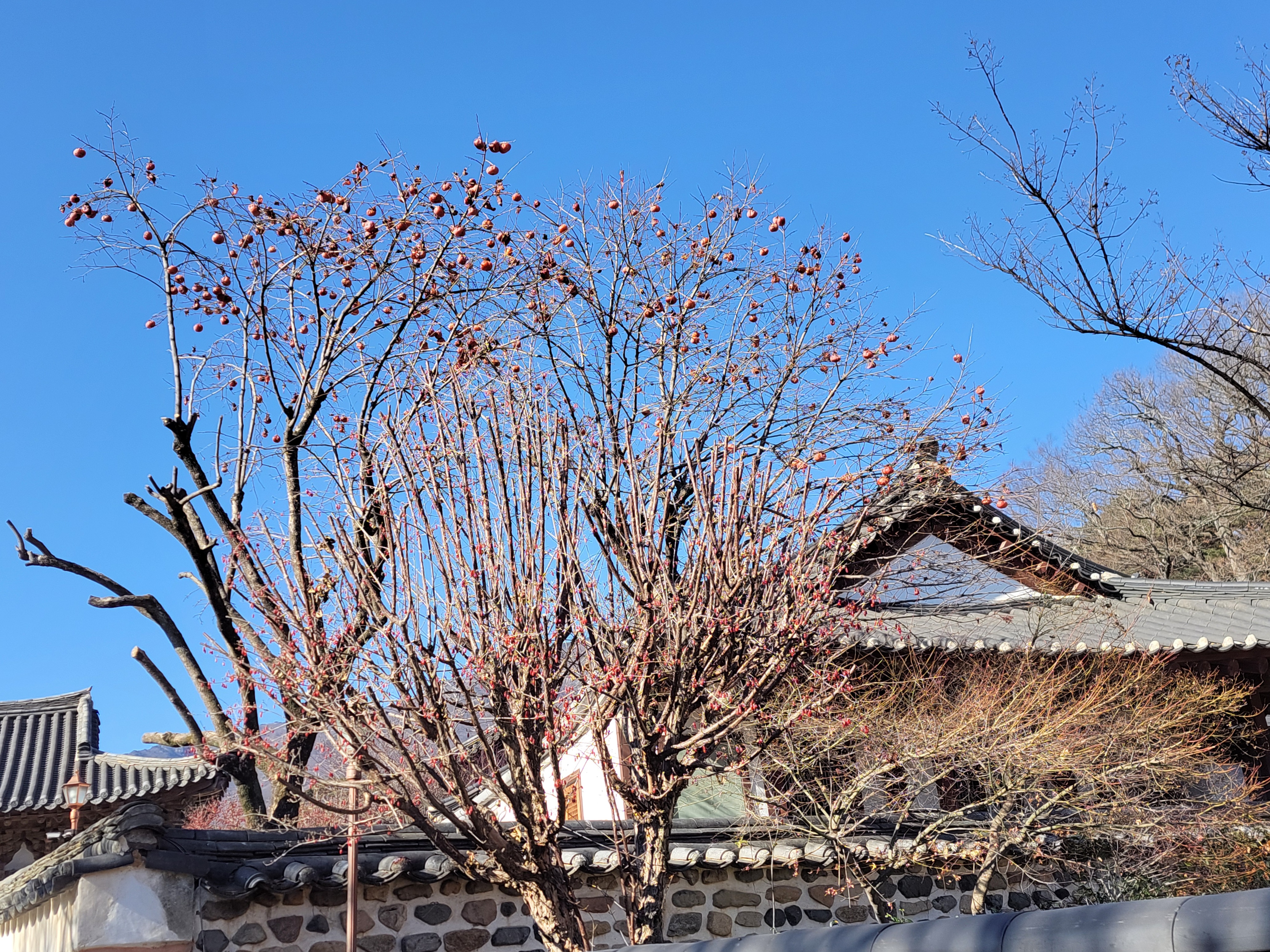 감나무 꼭대기 위의 쪼글쪼글한 감들이